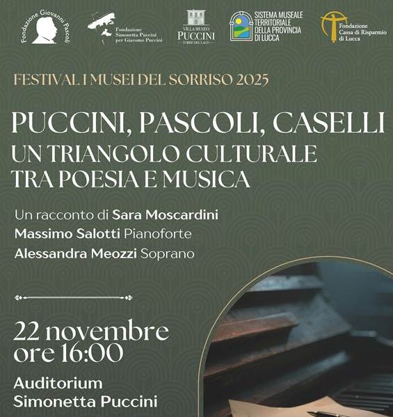 Nel contesto del Festival “I Musei del Sorriso 2025”, organizzato dal Sistema Museale Territoriale della Provincia di Lucca con il contributo della Fondazione Cassa di Risparmio di Lucca, la Fondazione Simonetta Puccini propone un appuntamento speciale dedicato al dialogo tra poesia e musica: “Puccini, Pascoli, Caselli – Un triangolo culturale tra poesia e musica”.