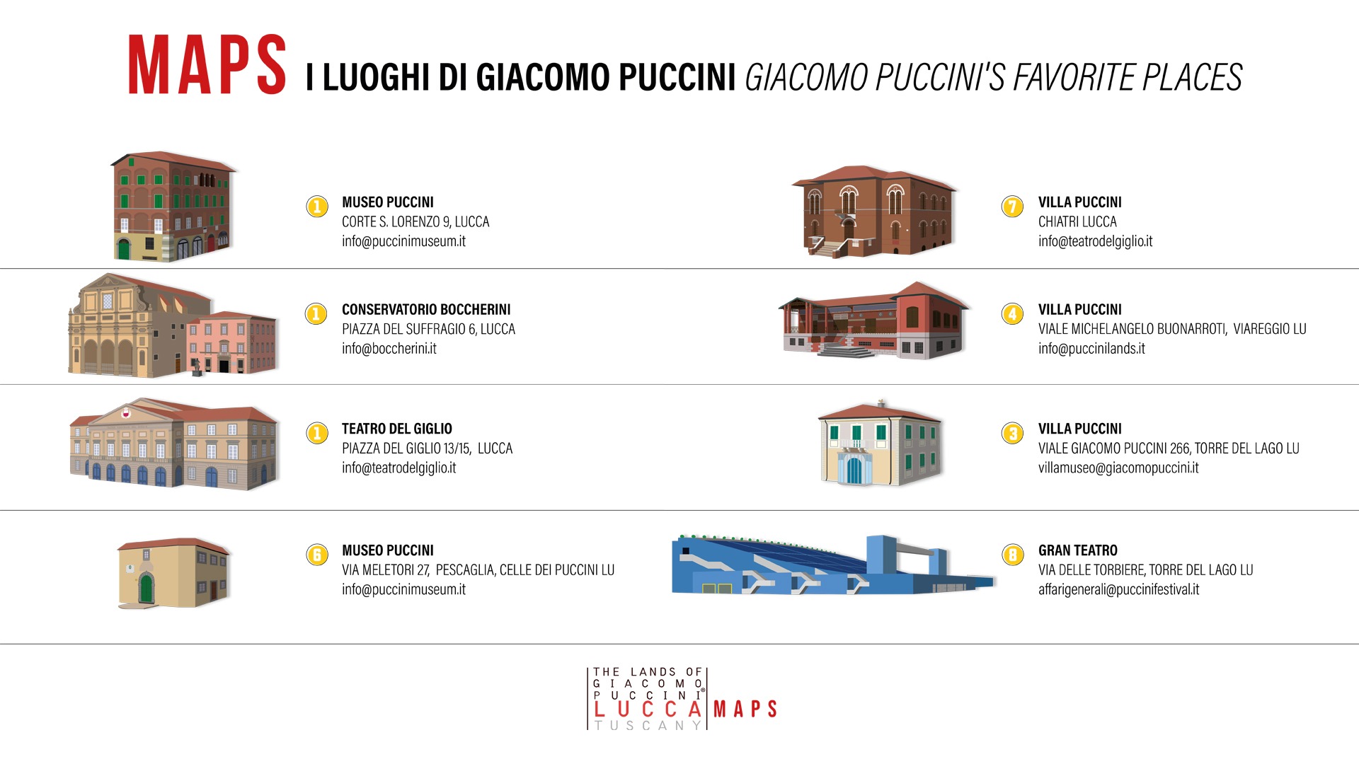 Partendo dal centro di Lucca in piazza Napoleone si sale sulle Mura rinascimentali per scendere da Piazza Santa Maria e uscire quindi dalla cinta muraria. Seguendo la ciclabile in via Barsanti e Matteucci si arriva a piazzale Don Baroni, dove si trova la rampa che attraversa il poggio del fiume Serchio e porta nel Parco Fluviale. Qui svoltando a destra → si procede sino all'incrocio con via per Camaiore. Una volta attraversato l’incrocio, avanzare in direzione del Ponte San Quirico per poi, appena prima del ponte, svoltare a destra → in via della Macchia. Da qui si prosegue sino al termine dell'itinerario ciclopedonale Puccini, all’intersezione con via Nazionale: svoltare a sinistra ← e procedere per circa 150 metri fino alla piazza Cesare Battisti di Ponte a Moriano. Da qui si ripete il percorso per tornare a Lucca.