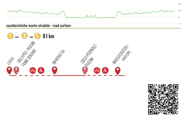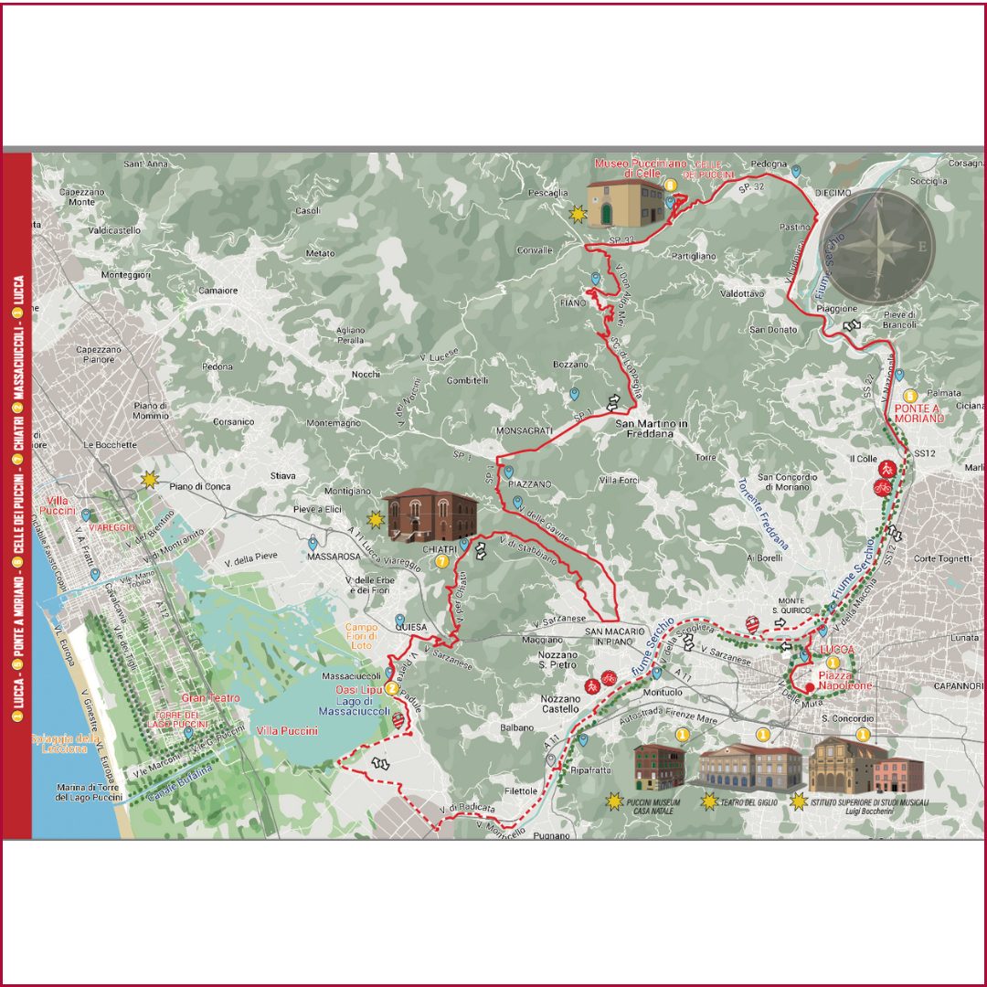 Partendo dal centro di Lucca in piazza Napoleone si sale sulle Mura rinascimentali per scendere in piazza Santa Maria e uscire quindi dalla cinta muraria. Seguendo la ciclabile in via Barsanti e Matteucci si arriva a piazzale Don Baroni, dove si trova la rampa che attraversa il poggio del fiume Serchio e porta nel Parco Fluviale. Da qui, svoltando a sinistra ← si segue l’itinerario ciclopedonale Puccini lungo l’argine del fiume Serchio sino al ponte di Ripafratta. Dopo averlo attraversato, svoltare a sinistra ← in via Alessandro Volta, una strada sterrata che costeggia il poggio, fino all’incrocio con la SP30 del Lungomonte Pisano. Si attraversa procedendo lungo via Monticello fino all’intersezione con via di Radicata. Qui si svolta a sinistra ← e si prosegue per 400 metri per poi tenere la sinistra ← in via dei Salcetti, passando attraverso il sottopasso autostradale. Proseguire fino al centro di raccolta GeoFor per poi svoltare subito a destra → e raggiungere un altro sottopasso autostradale: da qui inizia la strada sterrata che attraversa via di Traversagna Sud e conduce al Centro di bonifica "Le Pompe di Massaciuccoli”. Qui svoltare a destra → prima del ponte e proseguire lungo l’itinerario ciclopedonale Puccini per 3 km, fino ad un ponticello in legno sulla sinistra: attraversarlo e seguire il sentiero che porta in via delle Redole, per poi svoltare a sinistra ← in via del Porto ed arrivare all’Oasi LIPU sul Lago di Massaciuccoli. Da qui si ripete il percorso per tornare a Lucca.