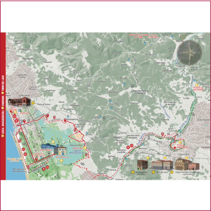 Partendo dall’Oasi LIPU di Massaciuccoli, percorrere via del Porto per poi svoltare a sinistra ← su via Pietra a Padule. Procedere per circa 1,5 km, fino all’incrocio con via del Molinaccio, prima del Parco G. Del Soldato: svoltare a sinistra ← in via della Piaggetta e poi a destra →, dove si trova un impianto idrovoro [(*) vedi sotto]. Si entra in una strada sterrata che porta in via delle Lenze, lungo la ferrovia, per poi raggiungere la stazione di Bozzano- Massarosa, dove inizia il percorso ciclopedonale dei Fiori di Loto che prosegue nella via Delle Erbe e Dei Fiori e conduce sino a via Portovecchio. Qui, prima del passaggio a livello, si prende via della Pieve sulla destra →, che porta sino alla rotatoria di Montramito: prendere la terza uscita e procedere in direzione Viareggio fino alla Torre Matilde. Attraversare il cavalcavia ferroviario, proseguire lungo via Regia per poi svoltare a destra → in via Fratti. Al termine di questa, entrare nella Pineta e seguire viale Capponi fino all’incrocio con via Marco Polo: svoltando a sinistra ← si raggiunge piazza Giacomo Puccini, dove si trova la Villa Puccini di Viareggio.