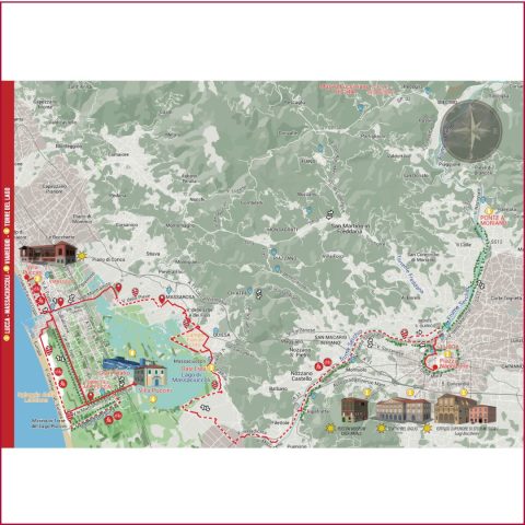 Partendo dalla Villa Puccini di Viareggio, procedere in direzione del mare lungo via Marco Polo per raggiungere la Pista Ciclabile Fausto Coppi e percorrerla interamente fino al Porto di Viareggio. Dopo aver attraversato i due ponti che conducono al lato sud del Porto, svoltare a destra → su via Michele Coppino per poi girare a sinistra ← in via Euro Menini. Se si desidera raggiungere Torre del Lago percorrendo strade asfaltate, altrimenti[(*)vedi sotto], svoltare a sinistra ← in via Virgilio. Immettersi nel viale dei Tigli, che si trova a destra →, e percorrerlo interamente fino all’incrocio con via G. Marconi: svoltare a sinistra ← e procedere dritto, superare il sottopassaggio ferroviario e proseguire ancora dritto fino a raggiungere Villa Puccini di Torre del Lago.