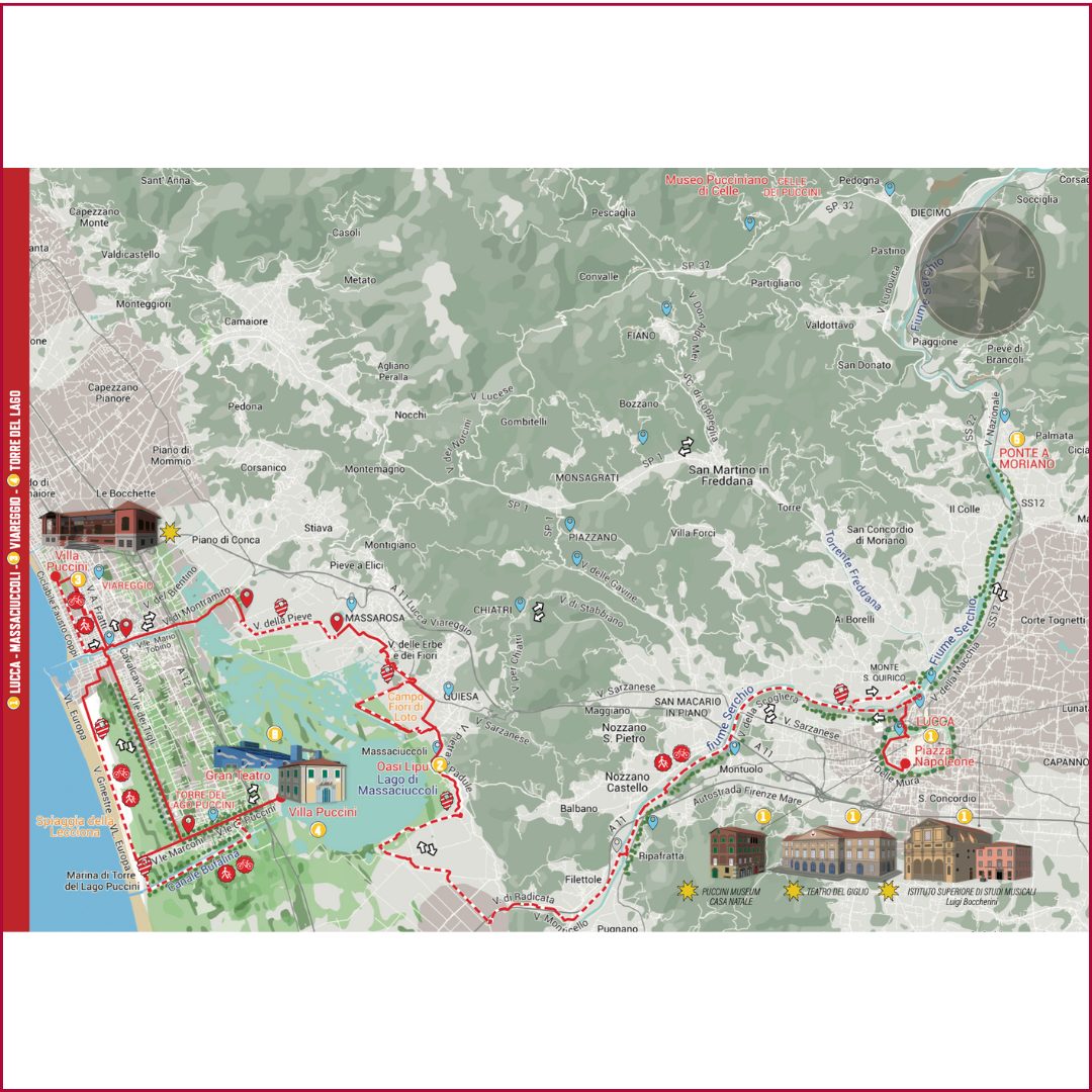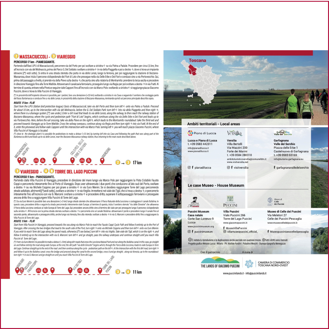 Partendo dalla Villa Puccini di Viareggio, procedere in direzione del mare lungo via Marco Polo per raggiungere la Pista Ciclabile Fausto Coppi e percorrerla interamente fino al Porto di Viareggio. Dopo aver attraversato i due ponti che conducono al lato sud del Porto, svoltare a destra → su via Michele Coppino per poi girare a sinistra ← in via Euro Menini. Se si desidera raggiungere Torre del Lago percorrendo strade asfaltate, altrimenti[(*)vedi sotto], svoltare a sinistra ← in via Virgilio. Immettersi nel viale dei Tigli, che si trova a destra →, e percorrerlo interamente fino all’incrocio con via G. Marconi: svoltare a sinistra ← e procedere dritto, superare il sottopassaggio ferroviario e proseguire ancora dritto fino a raggiungere Villa Puccini di Torre del Lago.
