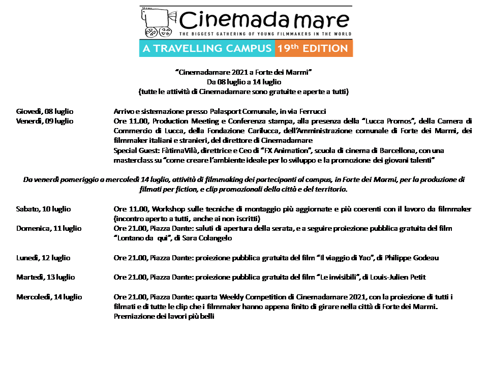 Dal 2003 attraversa tutta l’Italia durante i mesi estivi. Inizia a Roma a fine giugno e termina a Venezia in coincidenza con la Mostra Internazionale d’Arte Cinematografica, durante la quale Cinemadamare è presente con i giovani partecipanti al Campus.