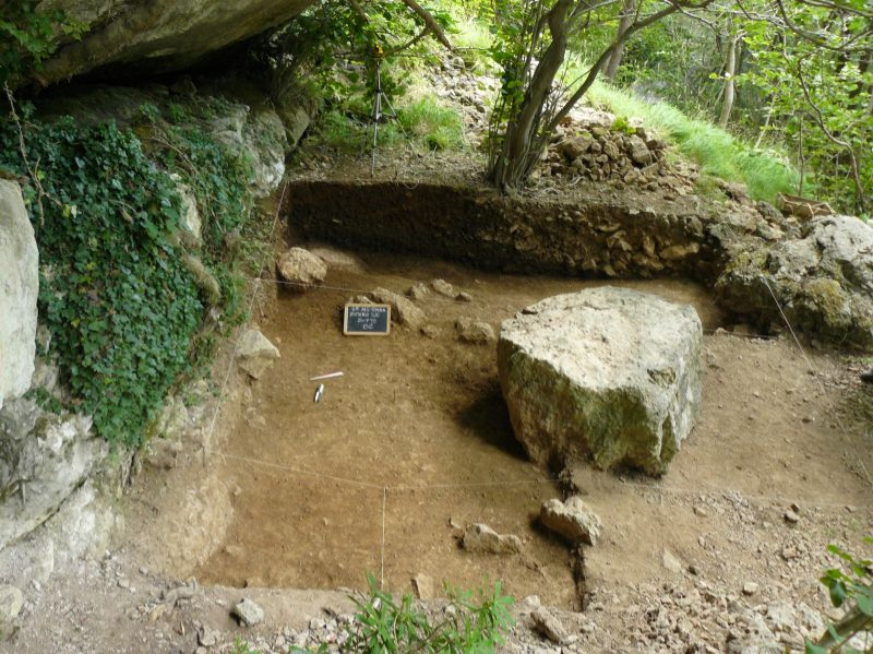 I primi utilizzatori della caverna furono i Neandertaliani, che praticarono la caccia nell'area circostante e che vi lasciarono i loro strumenti in selce insieme ai resti ossei delle loro prede. I cacciatori del Paleolitico Superiore (Homo sapiens) abitarono la parte più esterna della grotta, dove allestirono un grande focolare che ha restituito numerosi strumenti e resti ossei degli animali cucinati.