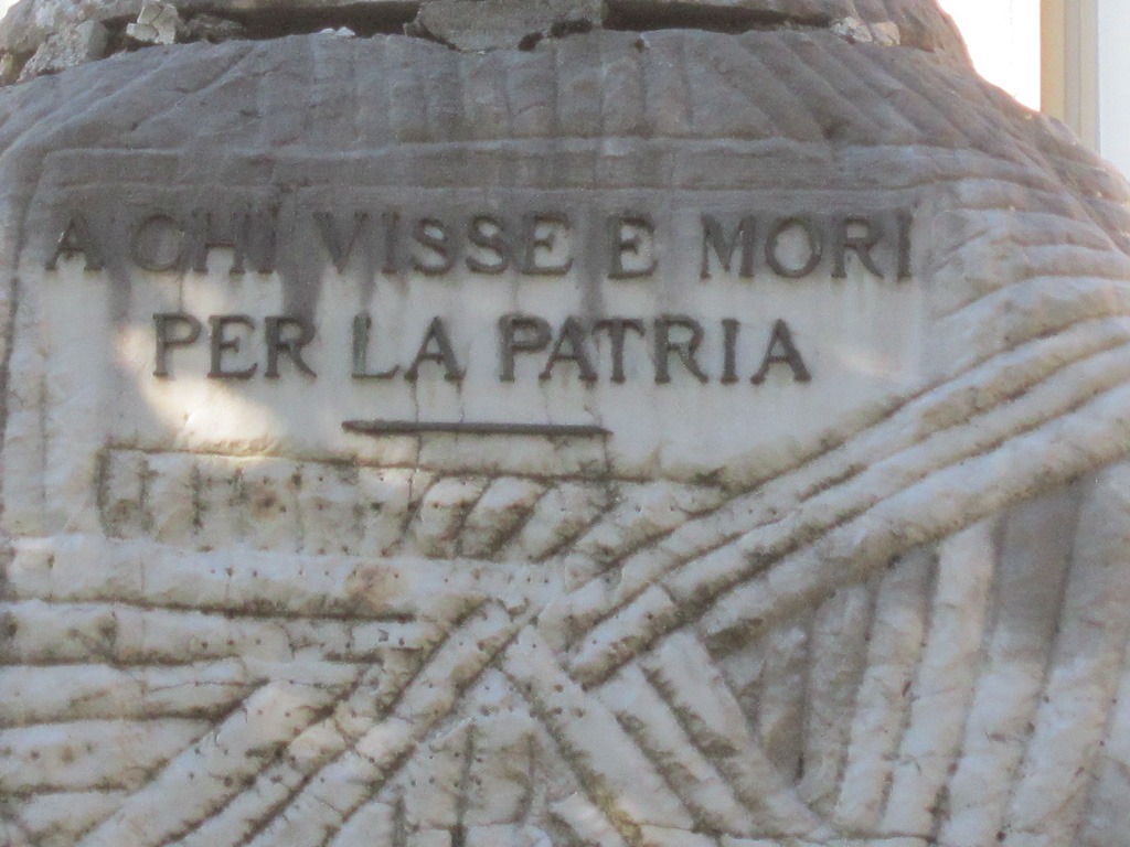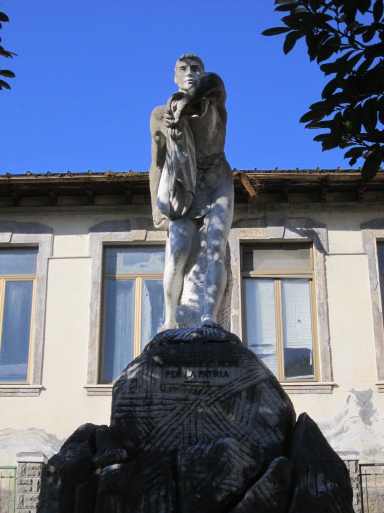 Il monumento scultoreo, insieme all’ex edificio scolastico,è dedicato al ricordo dei Caduti di entrambe le guerre. L’opera è composta da una statua di eroe in piedi poggiante su di un basamento che simula dei massi rocciosi. Il Fante ritratto nell’atto di lanciare una bomba, con ansia disperata e fiera, stringe, serrato al petto il drappo tricolore, in una estrema accanita difesa. In basso, di fronte alla roccia, si nota una targa con i nomi dei Caduti di entrambe le guerre, collocata successivamente per onorare anche i Caduti della seconda guerra.
